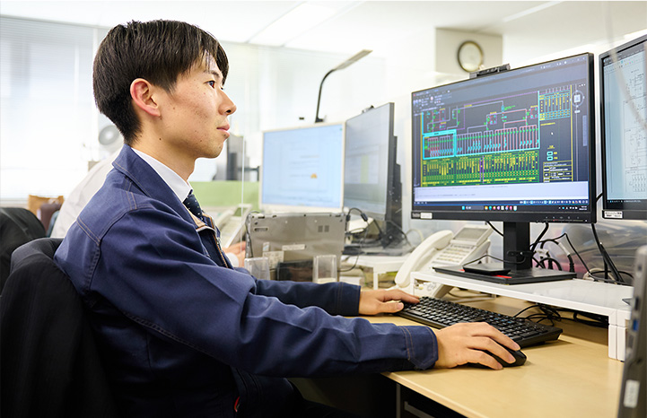 現在は施設技術部で、NEXCO西日本が発注する設備更新工事のための設計図面作成を担当しています。高速道路の設備のライフサイクルは長くて30年程度で、年数が経つと更新が必要になります。設備保守業務の現場を知っているからこそ、メンテナンスのしやすさや実際の運用を考えた設計ができているので、経験が活きていると感じます。また保全管理業務では、設備保守業務に従事している人が集めてきた点検データをもとに統計解析を行います。そのデータから「そろそろ設備を更新しないといけない」と判断をし、補修計画を立案することで高速道路の設備を守り続けています。実際に自分が計画した設備が施工され形になるのを見届けた時には、大きなやりがいを感じました。